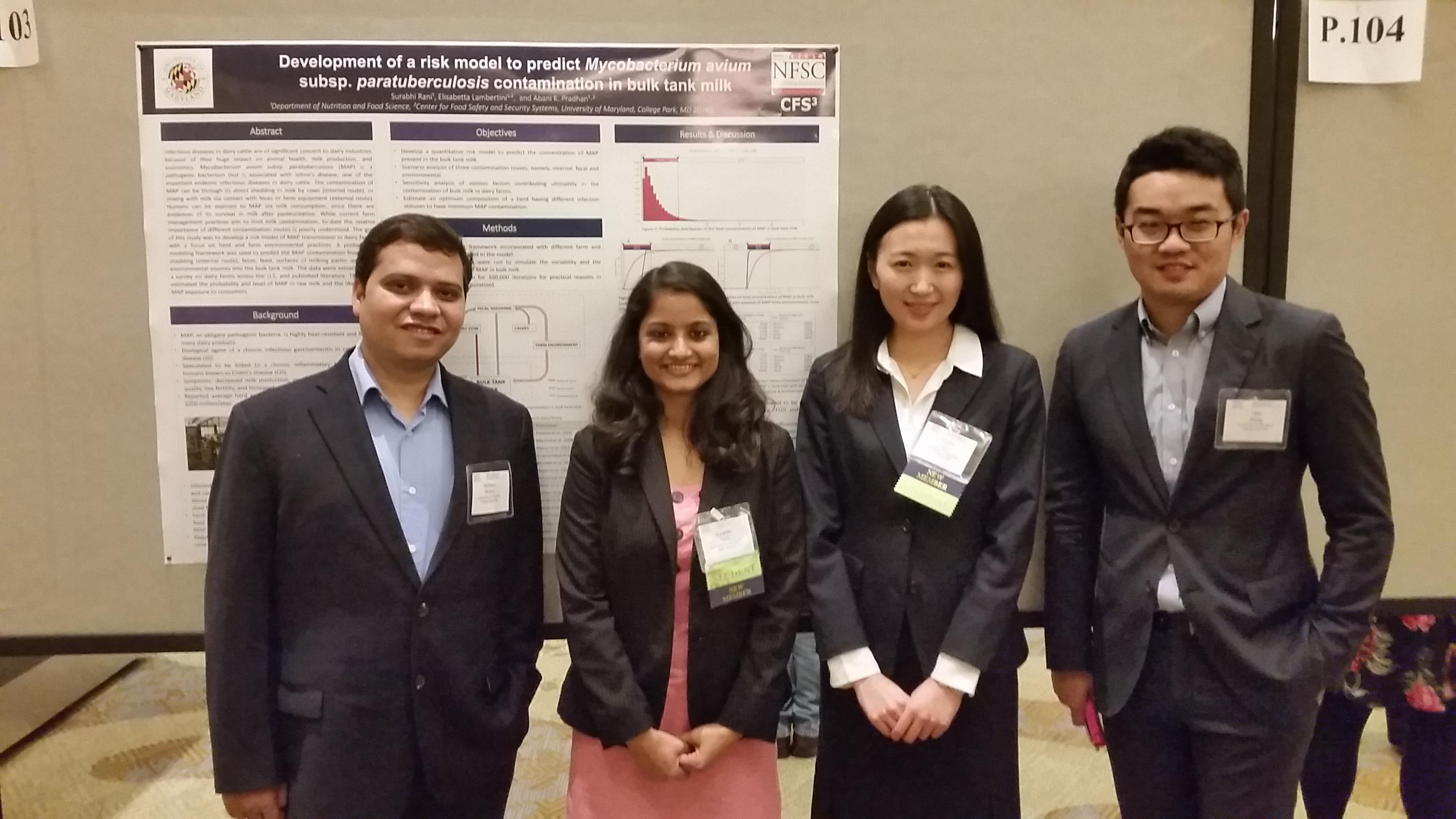 The Society for Risk Analysis (SRA) annual meeting was held on December 11-15, 2016, in San Diego, California. In the meeting, Abhinav Mishra and Hao Pang received the student merit award from the Microbial Risk Analysis Specialty Group. In addition, Yinzhi Qu, received one of the best poster awards. Dr. Abani Pradhan is the advisor of all three students.