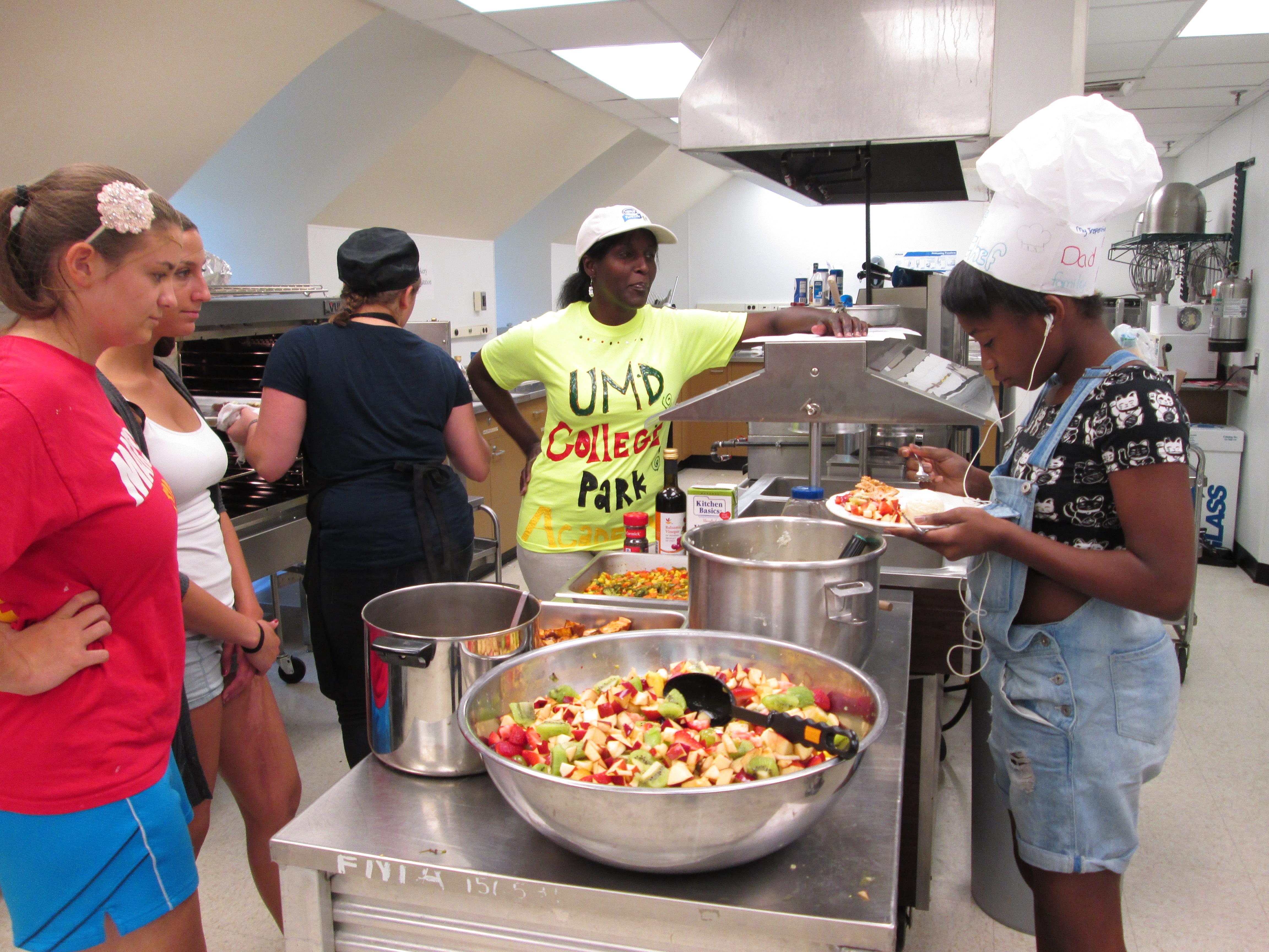 The culinary delights were the culmination of a week-long camp during which faculty and students from the dietetics program in the Department of Nutrition and Food Science at the University of Maryland taught the 10- to 14-year-olds how to “eat like experts.” They covered important topics like the different food groups and how to plan a balanced meal using the USDA’s MyPlate program. The young students also learned how to purchase healthy fruits and vegetables from a farmers’ market, practiced food safety measures by washing and storing the foods properly and got an eye-opening lesson about how much sugar soda contains – 77 grams in a bottle of Mountain Dew! “We had them actually scoop out 77 grams of sugar and they could not believe it,” said Margaret Udahogora, director of the undergraduate dietetics program.