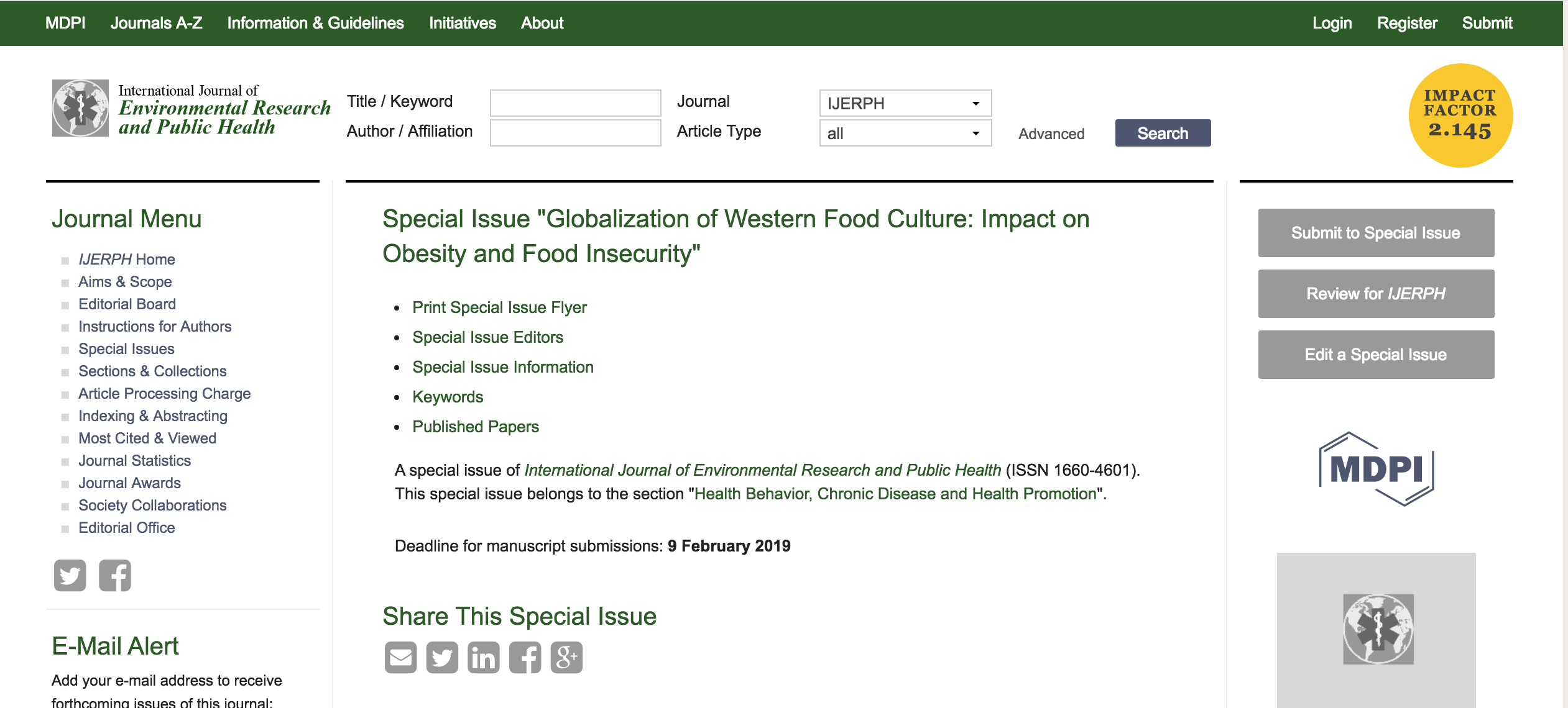 We are pleased to inform you that the website of our special issue "Globalization of Western Food Culture: Impact on Obesity and Food Insecurity" is ready for announcement.