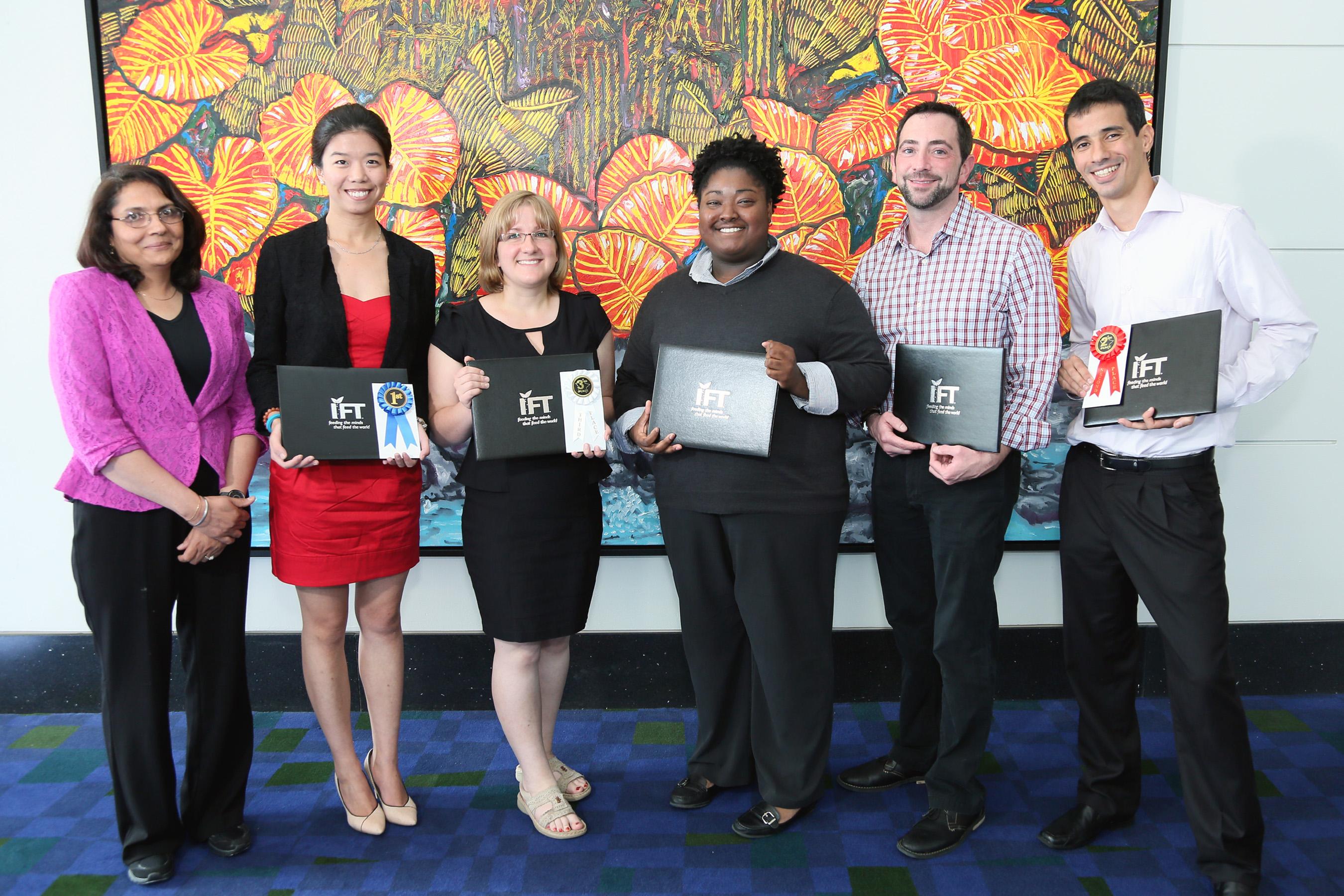 Melody Ge (2nd from the left) won the first place at IFT product development paper competition. Yuting Zhou (not pictured) won the third place award at the International Food Nanoscience Conference poster competition.