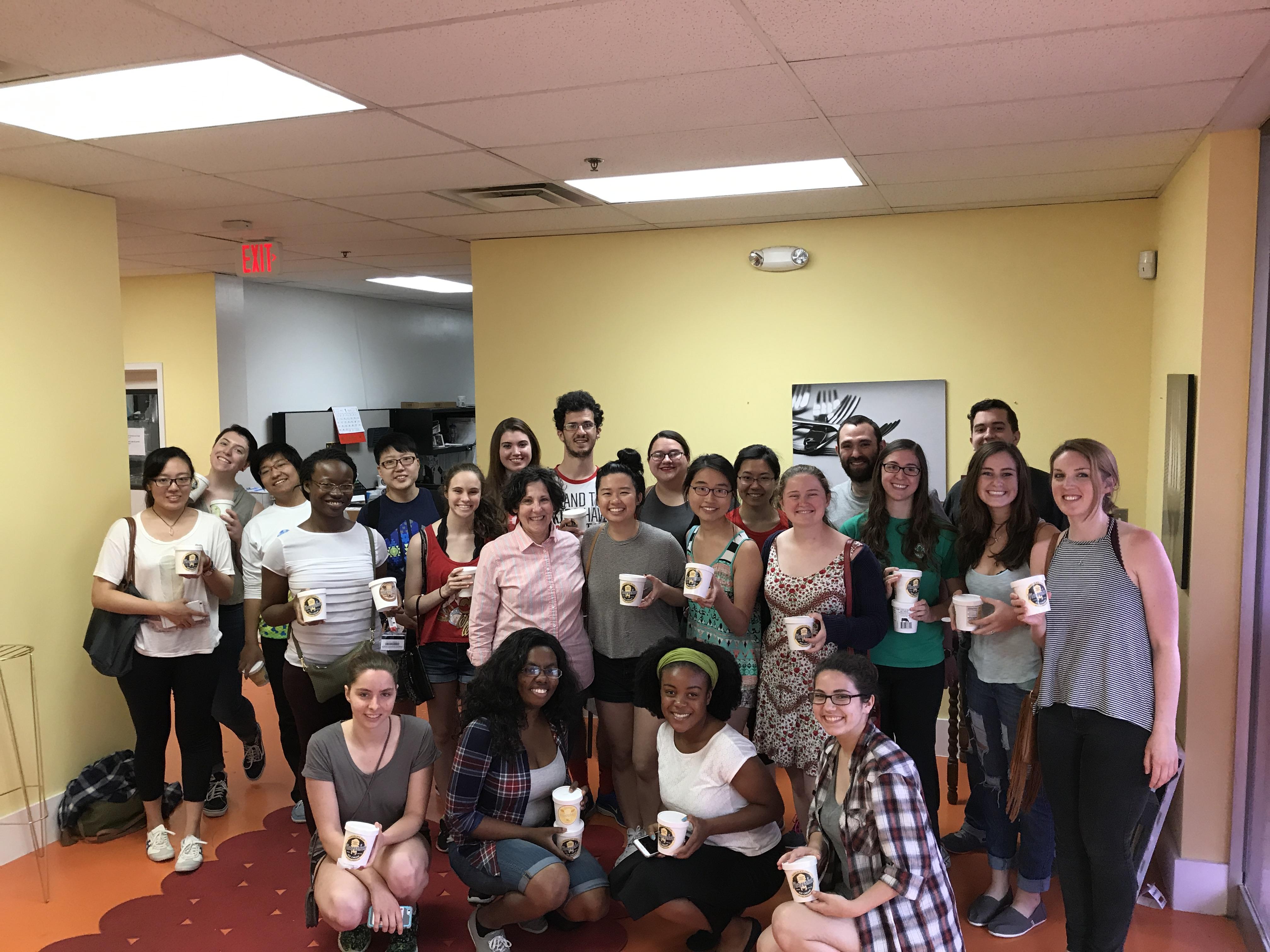 On April 30th, Food Science and Nutrition students had the exciting opportunity to tour Moorenko’s Ice Cream Factory located in Silver Spring, Maryland. Owner Susan Soorenko was kind enough to provide the group of 24 students with a private tour of the facility. Afterwards, students learned how to make ice cream the Moorenko way, participating in each step of the process, from measuring ingredients to melting chocolate to filling pints. Minutes after the Vanilla Stracciatella, a gelato variety similar to American chocolate chip ice cream, was churned, students were treated to fresh samples.