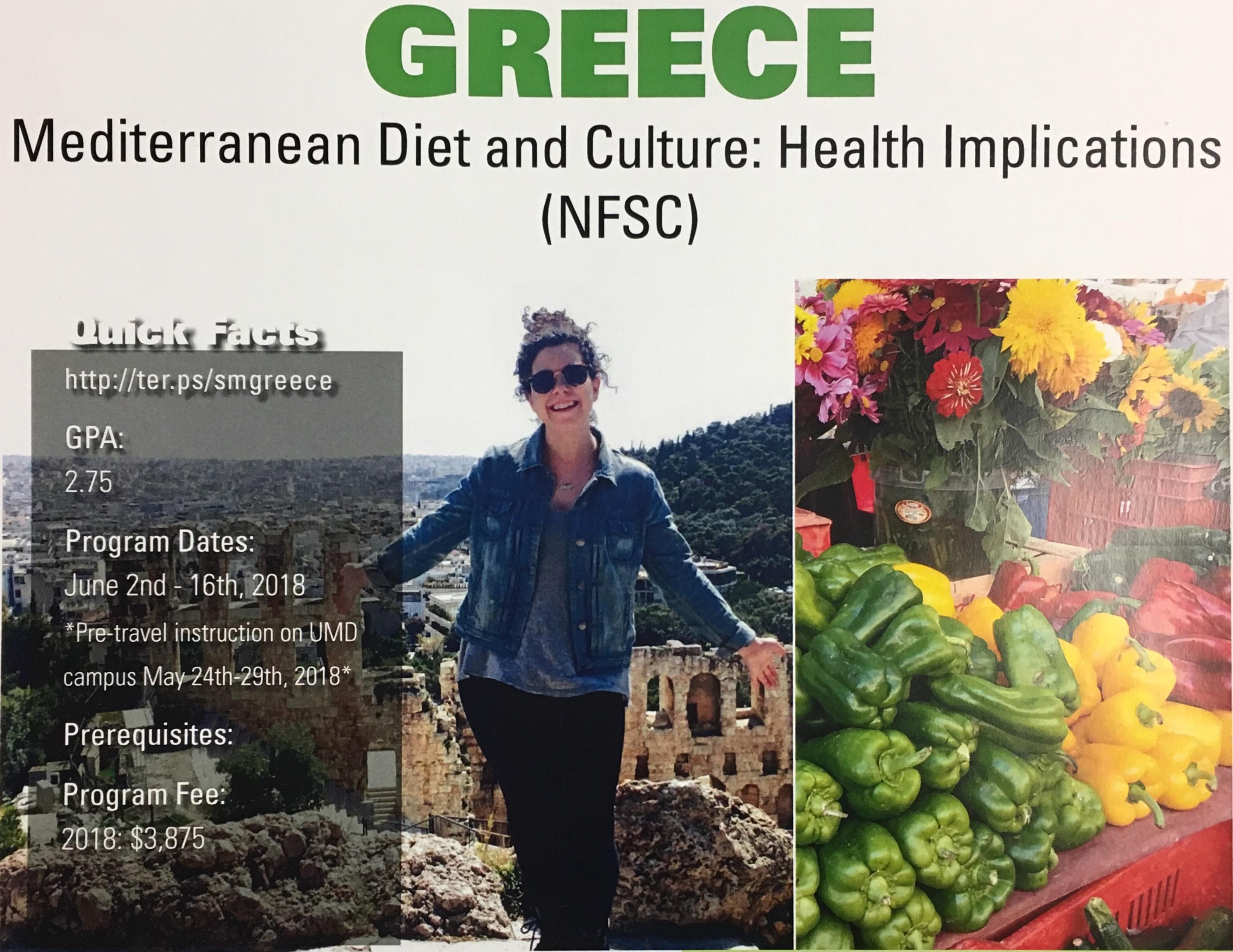 The Department of Nutrition and Food Science is offering a summer session 3-credit course on the Mediterranean diet and culture involving pre-travel instruction for 4 days at UMD and a 2-week travel to Greece. The length of the course, including travel to Greece, will be approximately 3 weeks and will include field trips, service learning and class time. Introductory classes will be presented by guest lecturers in Athens followed by lectures, activities and field trips in the Nafplion area. Activities will include exploring Greek cooking through demonstration and cooking classes and field trips to learn about the Mediterranean diet, cheese, yogurt and wine making, olive trees and olive oil processing and preservation. Hiking trips will be led in the surrounding areas to learn about Greek mythology and the exploration of wild herbs and their use in cooking.