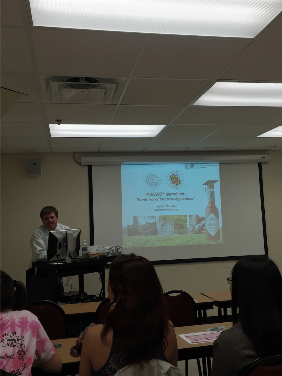 On November 30, Chef Jud McLester from the McIlhenny Company gave a guest lecture on Tabasco® to Food Science Club. Student attendees learned about the history of the McIlhenny Company and its products. After learning about the Tabasco® production process, students were treated to samples of Hot & Spicy Cheez-Its, Heluva Good! Dip, and dark chocolate wedges, all flavored with Tabasco® products.
